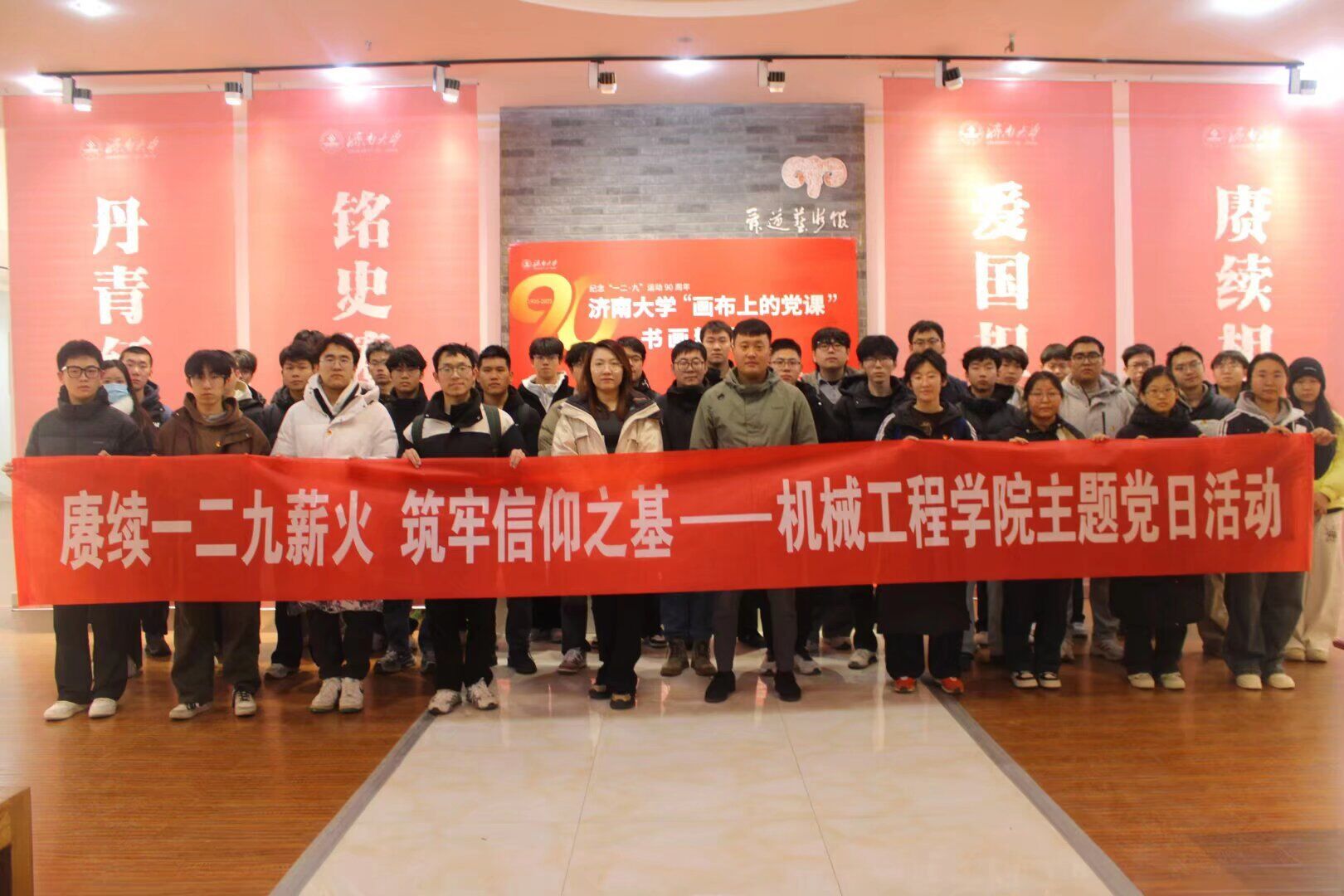 会后,学院组织全体新发展预备党员前往舜道艺术馆,参观济南大学纪念“一二·九”运动90周年“画布上的党课”书画精品展。展览中,一幅幅以红色历史、青年爱国奋斗为核心的书画作品,将“一二・九”运动里学子们的热血呐喊与新时代青年的使命担当鲜活串联,新发展预备党员们驻足作品前,深刻感悟先辈们不畏强暴、奋起抗争的爱国精神,党员们纷纷表示要传承红色基因,以更加饱满的热情投身专业学习与科技创新。